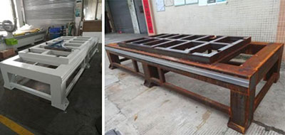 采用方鋼焊接,回火處理,消除焊接應(yīng)力,保證使用多年后不會(huì)變形。床身加強(qiáng)筋比較密集,增加了床身強(qiáng)度,保證底板不變形。 |